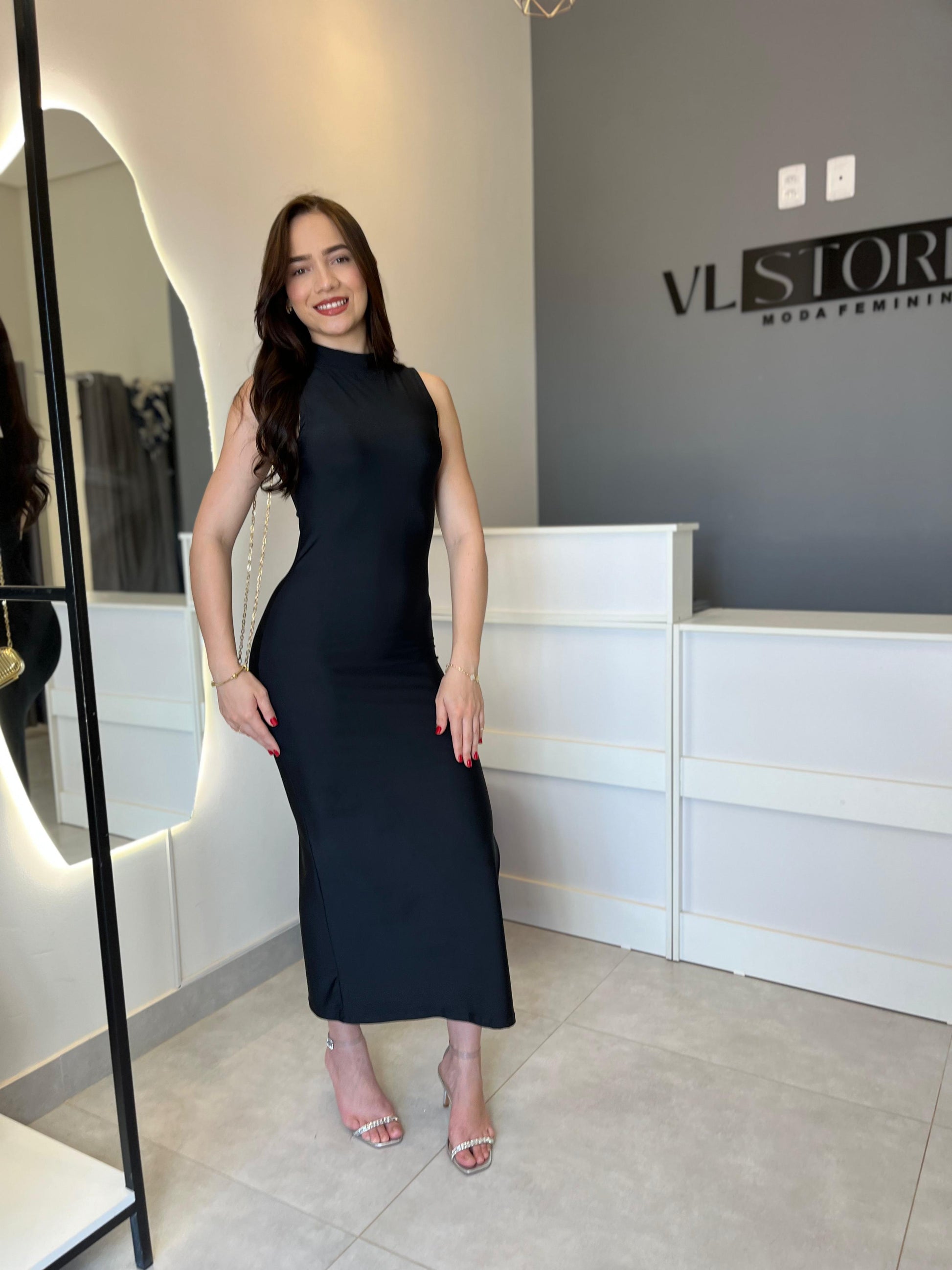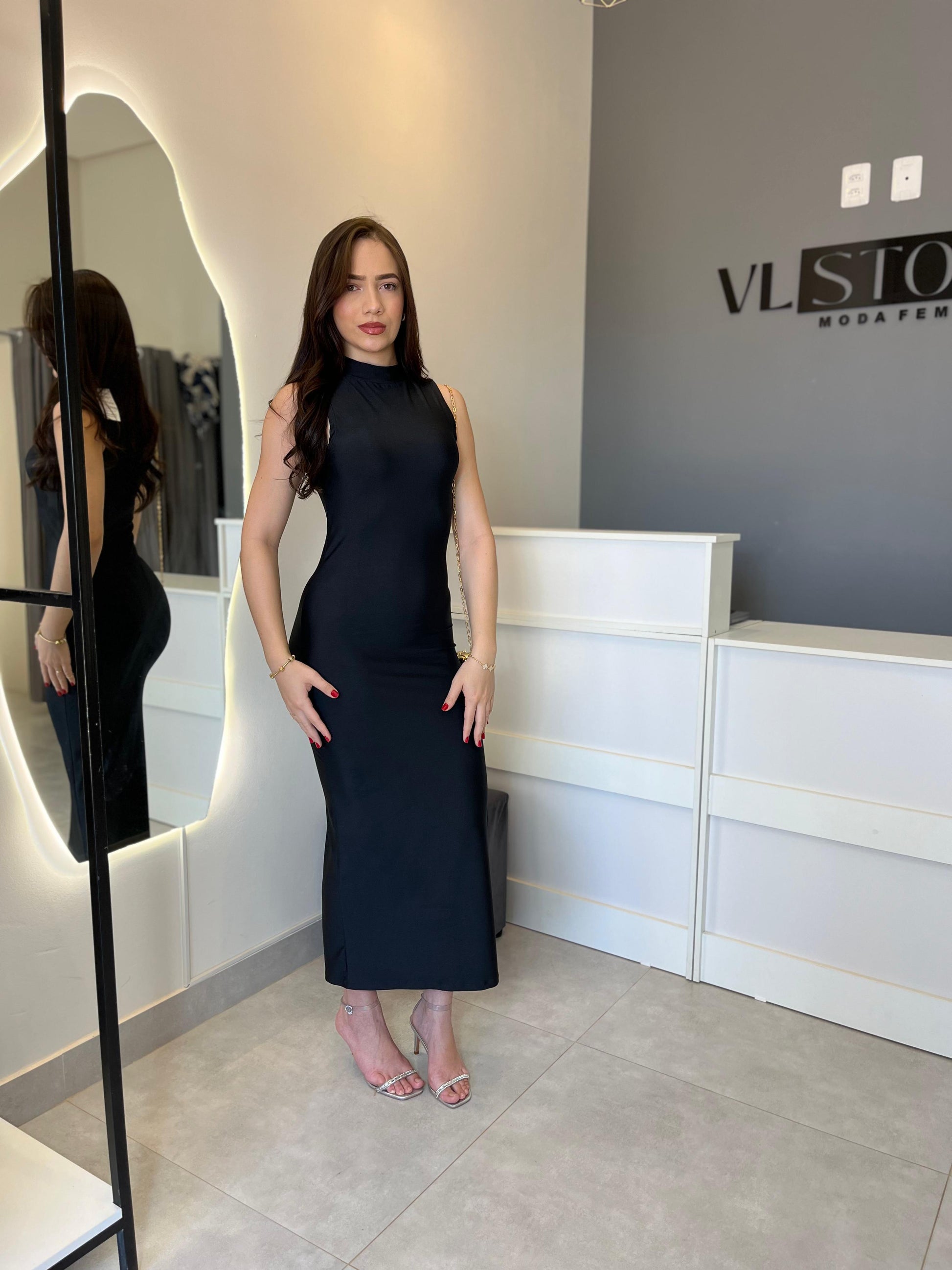 Vestido longo sem mangas, confeccionado em poliamida, oferecendo caimento leve e confortável. Sua modelagem reta e versátil garante um visual moderno e elegante, perfeito para diversas ocasiões, do dia a dia a eventos mais sofisticados.