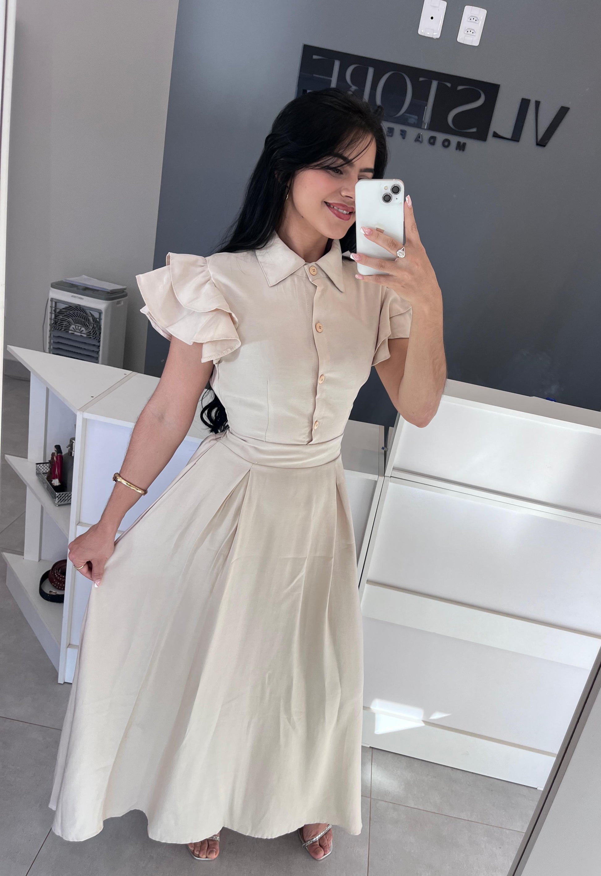 Detalhes: Gola dobrada, botões frontais, cintura marcada, saia ampla