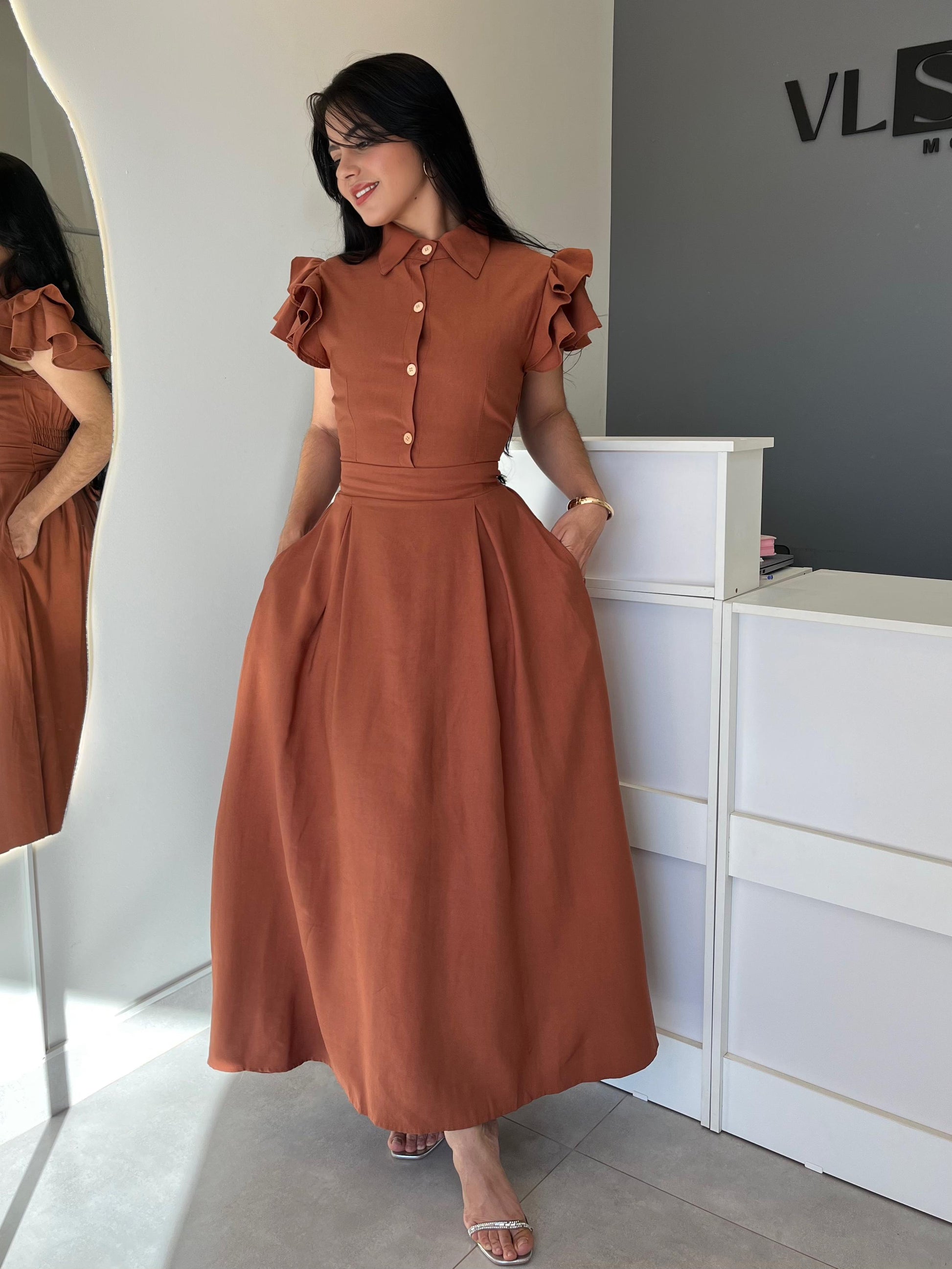 Clássico e sofisticado, o vestido longo Feminino em tecido sensorial é a escolha perfeita para quem busca elegância atemporal. Com gola dobrada e botões frontais, o modelo traz um toque refinado e versátil. A cintura marcada valoriza a silhueta, enquanto a saia ampla garante movimento e conforto. Ideal para jantares, eventos sociais ou até produções casuais mais arrumadas.